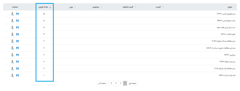 با کلیک بر روی ستون تعداد فروش و مرتب‌سازی نزولی این ستون، می‌توانید پرفروش‌ترین محصولات خود را مشاهده کنید.