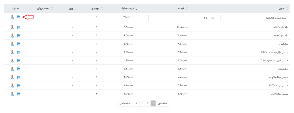 در ستون عملیات، دو آیکون نمایش داده شده است. آیکون «ذخیره» برای ذخیره تغییرات و آیکون «آدمک» برای نمایش کاربرانی است که این محصول را خریداری کرده‌اند. با کلیک بر روی این آیکون، اطلاعات سفارش‌ها و کاربرانی که این محصول را انتخاب کرده‌اند مشاهده خواهد شد.