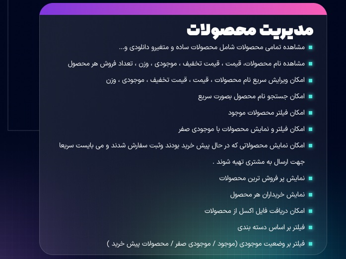 • امکان فیلتر محصولات موجود؛